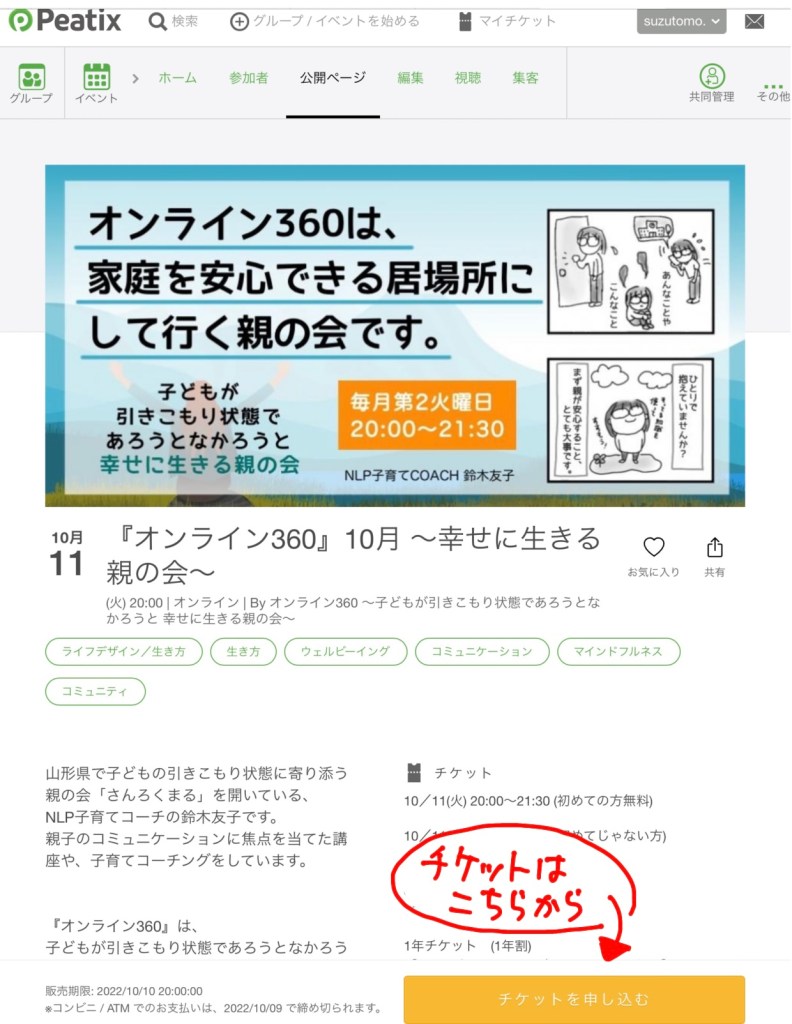 こちらをクリックすると、Peatixのサイトが表示されます。