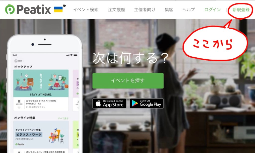 手順1:Peatixのアカウントをお持ちでない方は、作成が必要になります