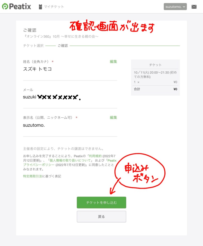 ※登録完了後、登録したメールアドレスにPeatixより メールが届きます。@peatix.comからのメールが受信できるよう設定しておいてくださいね。