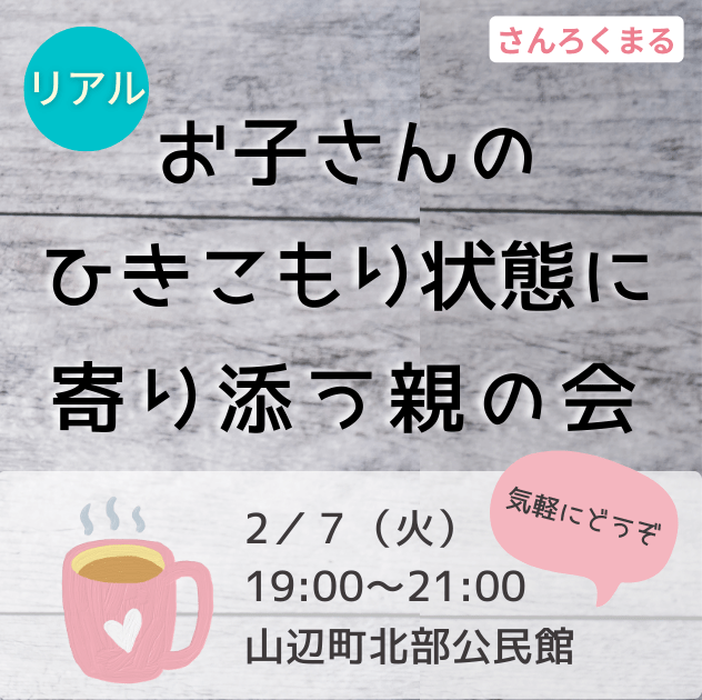 親の会、親の会・家族会 お子さんの引きこもり状態に寄り添う親の会「さんろくまる」2月のお知らせ 親の会さんろくまるは、山辺町北部公民館をお借りしています。 個人で開催する親の会で、お申し込みは不要です。 誰かに話すことは、心を軽くしてくれます。 初めての方もお気軽にどうぞ。 関連