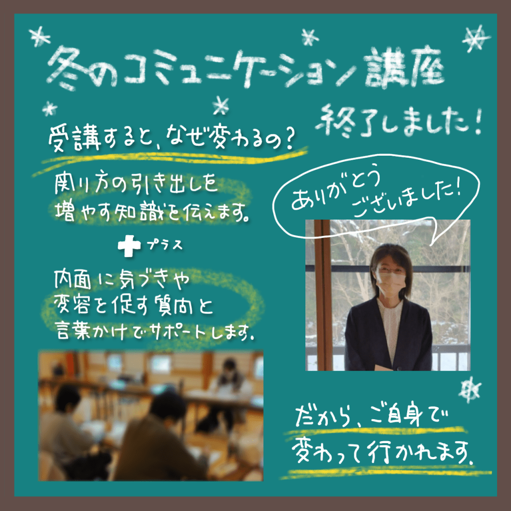 今年の冬も、山辺町北部公民館で「家庭を安心できる居場所にするためのコミュニケーション講座」を開催しました。