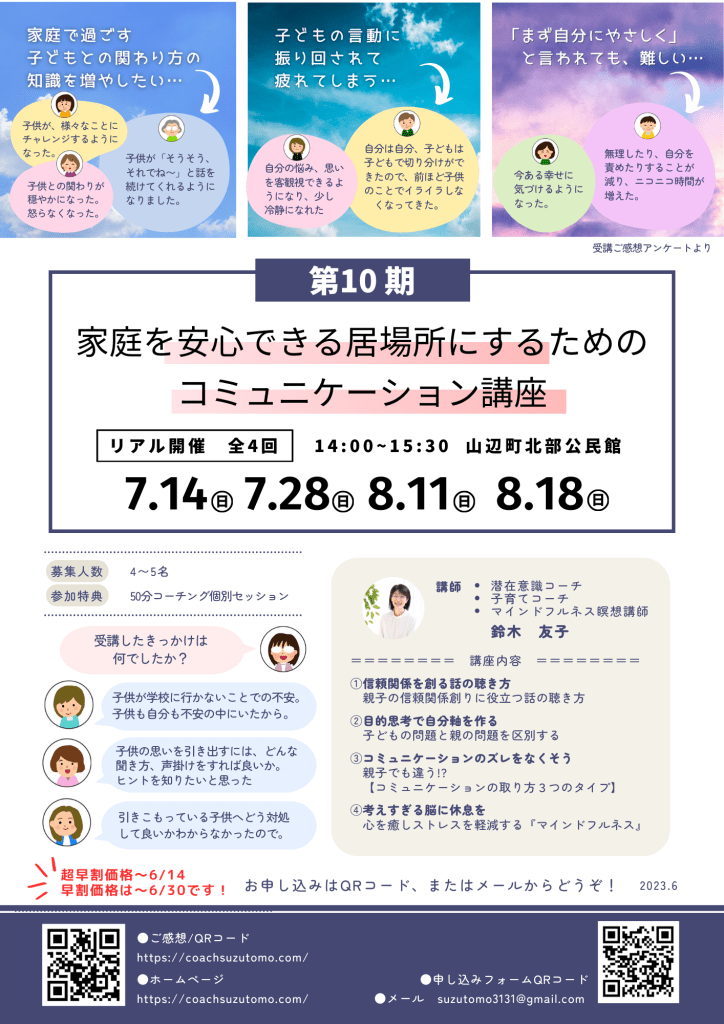 コミュニケーション お子さんの不登校、引きこもり状態が、受講のきっかけという方が多いです チラシをリニューアルしました! 超早割価格は 6/14まで早割価格は 6/30までです。 受講を検討されている方は、どうぞお早めにお申し込みくださいね。オンライン個別受講も、同期間 割引価格です! 家庭を安心できる居場所にするためのコミュニケーション講座2024年 7/14スタート第10期 お申し込み受付中! 関連