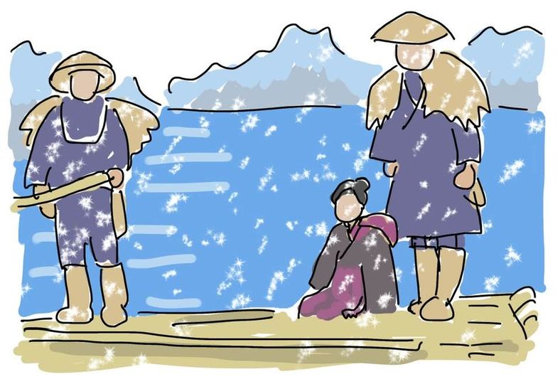 と叫んで、雪が降りしきる中、冷たい川を下る船に乗って奉公先に行く